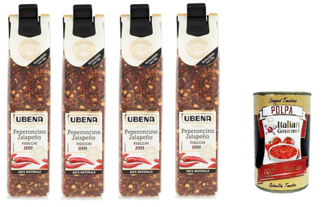 Ubena Peperoncino Jalapeño In Fiocchi, Jalapeño Chilli Flakes, Intense Sharpness, Ideal for Exotic Dishes, Gyros and Chili con Carne, Clip Bag Format 4 x 25 g + Italian Gourmet Polpa 400 g
