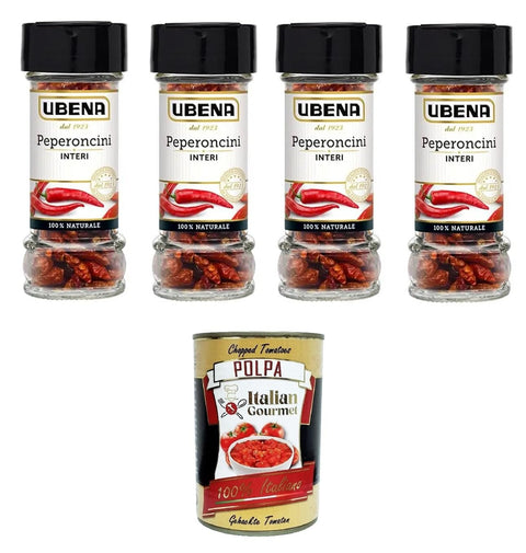 Ubena Peperoncini Interi, Whole Chilli Peppers, Intensive Sharpness, Ideal for Exotic Dishes, Gyros and Chili con Carne, 4 x 12 g Glass Vase + Italian Gourmet Polpa 400 g