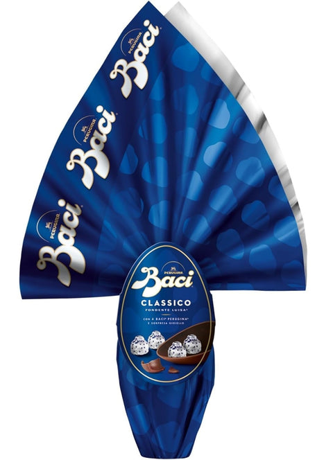BACI PERUGINA Easter Egg with Luisa Dark Chocolate; gluten-free. Contains 4 BACI PERUGINA Classico pralines. The BACI PERUGINA Easter Egg contains a refined surprise, created by Venetian goldsmiths and produced entirely in Italy. Sustainably sourced cocoa, Rainforest Alliance certified. 215g Easter Egg with 50g of BACI PERUGINA pralines.