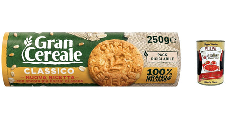 Ingredients: oatmeal 34.8%*, WHEAT WHEAT flour 28.5%*, sunflower oil, sugar, glucose syrup, whole wheat spelt flour (wheat) 3.2%*, barley whole grain flour 3.2%*, raising agent (ammonium hydrogen carbonate, sodium hydrogen carbonate), salt. Natural olive Extract. *Percentages refer to the finished product. May contain traces of nuts, milk, mustard, soy and eggs. Store in a cold and dry place. Grancereale Classico is made exclusively from whole flour, without using other types of flourFree Italian gourmet polpa di pomodoro - 400 g