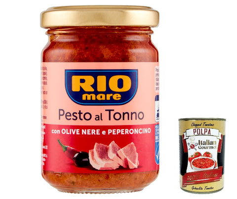 6 x Rio Mare Pesto al Tonno con Olive Nere e Peperoncino, Tuna Pesto Cooking Sauce with Black Olives and Chili 130 g + Italian Gourmet Polpa 400 g