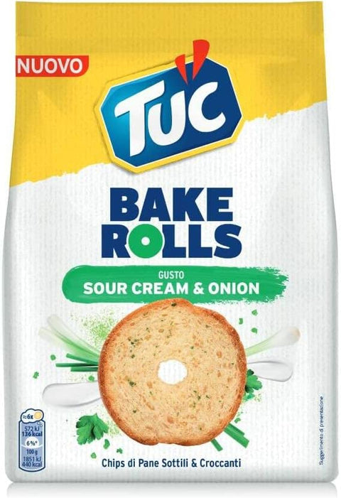 TUC was born in 1958 with its famous octagonal shape and unrepeatable sweet-salty taste. TUC has always accompanied us at home and on the go with different flavours and shapes with 100% TUC DNA. We produce TUC Cracker, TUC Puff Pastry and TUC Crisp in Piedmont at the Capriata D'Orba (AL) plant with 100% Italian wheat. In addition, the wheat we select is part of the Harmony sustainability program, in which we are committed to protecting the soil, biodiversity and reducing CO2 emissions. From today, the Tuc family is expanding. With our thin and crispy Tuc BakeRolls bread chips, it takes a new shape. Scented bread slices that bring a taste explosion and shine for a rolling break. Try all 4 variations: original, tomato and olives, pizza, sour cream and onion. At any time of the day, if you feel a slight growl in the stomach or want a delicious snack, TUC is there for you. So remember, THERE IS A TUC FOR EVERYTHING. AND FOR EVERYONE. Ingredients wheat flour, sunflower oil; 13%, sugar, salt, dextrose, onion powder 0.90%, sour cream powder (milk) 0.31%, modified starch, baking powder, parsley powder 0.11%, yeast extract, garlic powder, acidity regulator (lactic acid), natural aroma, yeast, bean flour, emulsifier (Natriumstearoone one yl-2-lactylate), flour treatment agent (ascorbic acid, L - cysteine), wheat starch. May contain eggs, peanuts, nuts, sesame seeds, celery.Tuc Bake Rolls Sour Cream Onion Flavour: for a taste explosion