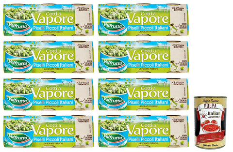 8 x Valfrutta Piselli Piccoli Italiani, Small Italian Peas, Legumes Vegetables Steam Cooking, Cans 3 x 150 g + Italian Gourmet Polpa di Pomodoro 400 g Tin