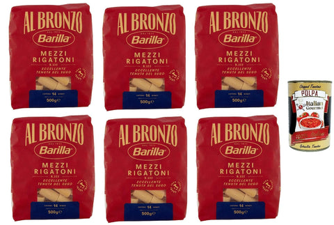 Barilla Al Bronzo Mezzi Rigatoni - 6 x 500 g (3 kg) | Extra Rough & Sauce Binding, Durum Wheat Semolina, Premium Pasta Storage Pack, al Dente Approx. 14 Minutes + Italian Gourmet Polpa