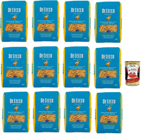 De Cecco Penne Piccole Rigate n°177, Pasta 12 x 500 g, Slow drying, High quality durum wheat semolina, Cooking 12 min (al dente 10), Ideal sauces & gratins + Italian Gourmet polpa 400 g