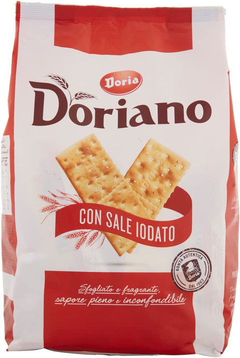 The good salty cracker on the surface, ideal for a delicious snack at any time of day and perfect to table instead of bread, with any type of food. The use of real ingredients such as flour, oil and salt, the long rising of the dough, the inimitable layered peeling, the original recipe and a unique processing method in Italy make Doriano a completely different cracker, as good and fragrant as freshly baked bread. Ingredients: wheat flour vegetable oils (palm, coconut) iodized salt (1.4%) barley malt flour yeast (gluten) salt. Attention: it may contain traces of soy. Store in a dry place away from heat sources. Nutritional values for 100 grams of product: Energy: 1863 kj / 443 kcal fat: 15 g of which saturated fatty acids: 8.8 g carbohydrates: 66 g of which sugar: 2.3 g proteins: 10 g salt: 2.2 g nutritional values for a cookie (2. 9 GRAMM PRODUKT): Energy: 540 kj / 128 kcal fats: 4.2 g of which saturated fatty acids: 2.5 g carbohydrates: 19 g of which sugar: 0.7 g proteins: 3.0 g salt: 0.64 gIngredients: whole wheat flour (50%), sweetener: maltitol, uncured vegetable palm fats, eggs (8%), salt, raising agent: disodium diphosphate, sodium bicarbonate, ammonium bicarbonate.Ingredients: wheat flour vegetable oils (palm, coconut) iodized salt (1.4%) barley malt flour yeast (gluten) salt