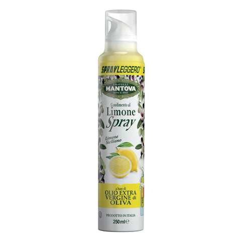 Lemon seasoning spray 250 ml based on extra virgin olive oil and essential oil of Sicilian lemons. The fresh and citrus notes of Sicilian lemons blend with the fruity notes of cold-extracted Extra Virgin Olive Oil, creating a symphony of flavors and aromas. Extra Virgin Olive Oil flavoured with Sicilian lemon essential oil. This seasoning is prepared with fine extra virgin olive oil and selected essential oils of Sicilian lemons free of the acid component. Sprayleggera lemon flavoured is an extremely versatile seasoning. It allows you to have an ally always ready to help you in the kitchen to enrich every dish with the scent of fresh lemon without giving acid notes. This seasoning is great for making delicious marinades for meat and fish by degreasing the cooking of these foods. Perfect for dressing salads in a light, controlled and tasty way. Excellent vinegar substitute We recommend using this seasoning on meat and fish carpaccio and for those on vegan diets to flavor soy burgers. Thanks to the "bag on valve" technology, the special Sprayleggera bottle allows you to reduce consumption by approximately 90% (a 250 ml bottle is equivalent to about 3 litres of a normal oil bottle) and protects the contents from air and light for a long time. This allows you to maintain all the valuable properties of the seasoning and keep it fresh as freshly squeezed. Each second of spray dispenses 2ml/1.7g (15Kcal) of product enough to season each dish.Lemon condiment spray based on extra virgin olive oil and essential oil of Sicilian lemons. The fresh and citrus notes of Sicilian lemons blend with the fruity notes of cold-extracted Extra Virgin Olive Oil, creating a symphony of flavors and aromas.