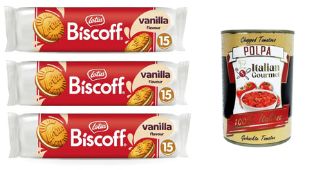 Lotus Biscoff Biscotto Sandwich with Ripieno al Gusto Vaniglia Sandwich Biscuit with Vanilla Filling | 15 Biscuits per Pack 3 x 150 g + Italian Gourmet Polpa 400 g