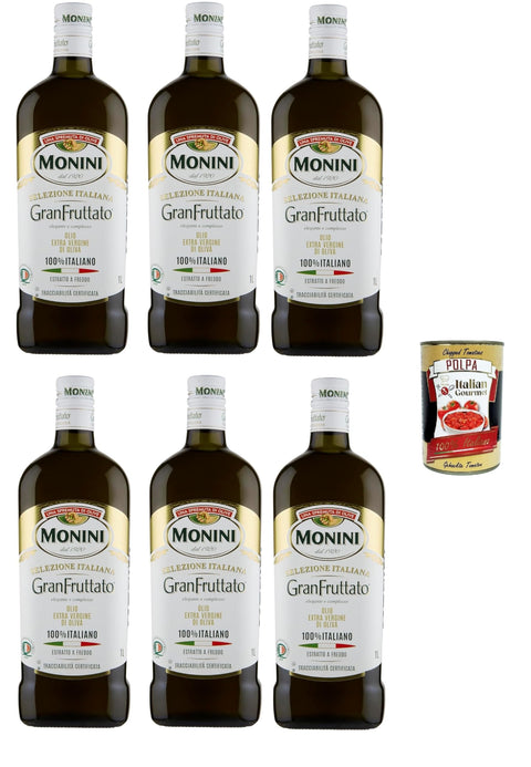 Monini GranFruttato Olive Oil Extra 6 x 1 L - 100% Italian, Cold Extracted, Intense Fruity, Gourmet Quality, Certified Traceability, Storage Pack + Italian Gourmet Polpa