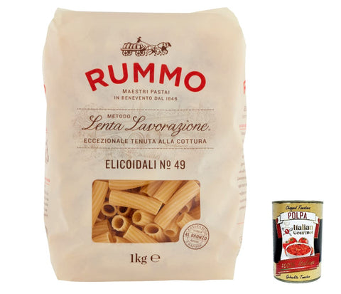 Rummo Elicoidali N. 49 Durum Wheat Semolina Pasta Italian Noodles 1 kg Pack + Italian Gourmet Polpa di Pomodoro 400 g Tin Pack of 12