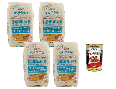 Free Italian gourmet polpa di pomodoro - 400 gPremium Gluten Free Pasta - Rummo Elicoidali No.49 made from whole grain rice and corn flour, ideal for people with coeliac disease or gluten-free diets.