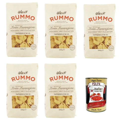 Rummo Pappardelle No. 119, Pasta Lenta Lavorazione Pasta Made of Durum Wheat Semolina Bronze Drawing 5 x 500 g + Italian Gourmet Polpa 400 g