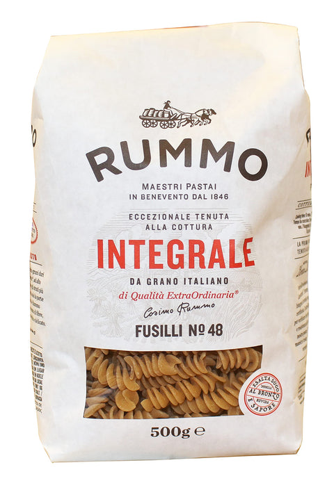 The world's first whole grain pasta with certified cooking resistance. Slow processing method Thanks to the exclusive slow processing method, Rummo is the first whole-grain pasta in the world with certified cooking resistance. We carefully inspect each batch to ensure it meets the parameters toughness and chewing resistance. For this reason, our pasta is the only ones that can permanently guarantee the same exceptional cooking resistance. Certified Legendary Quality - 1846 Selected by the best chefs in the world. Fine flavour. High fibre content. Well-being and taste. For my whole grain pasta, I have selected Italian durum wheat of exceptional quality with high protein content and removed the hard outer layers and bitter, preserving only the inner part of the bran. The result is Rummo Integrale, a pasta with high fibre content, but at the same time soft and delicate taste. Fusilli are a typical Italian format of the South, where they are known in all regions with a different name and form depending on local gastronomic traditions. COOKING 8 MINUTES Ingredients: Whole grain durum wheat semolina May contain traces of soy Allergens: May contain soy. Contains wheat/wheat. Rich in fibre. Average nutritional values per - 100 g. Power: 1476 kJ. 348 kcal. Fats 1.9 g of which: saturated fatty acids 0.4 g carbohydrates 65.3 g of which sugars 2.5 g fibres 6.2 g protein 14.5 g salt 0.01 gThe world's first whole grain pasta with certified cooking resistance. Slow processing method Thanks to the exclusive slow processing method, Rummo is the first whole-grain pasta in the world with certified cooking resistance.