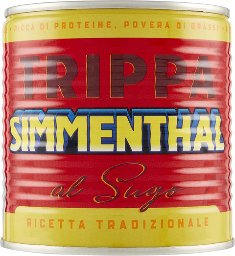 Description Simmenthaler tripe are a tasty, country typical recipe. Born a poor dish, tripe is now a main ingredient of many tasty recipes. The Simmenthaler tripe are inspired by the most authentic Italian gastronomic tradition, made from carefully selected ingredients and prepared according to the traditions and care of the past. Tender beef in a rich and savory sauce, the Simmenthaler tripe are ideal for a tasty main course that is ready in minutes. Simply place in a pan and heat for 5 minutes. To add a personal touch to the recipe, you can add two or three tablespoons of broth and tomato chunks and sprinkle the tripe with grated Parmesan. These Simmenthaler tripe are in a pack of 1 tin of 420 grams. The average nutritional values per 100 grams total product are: - 2 grams of fat, of which 0.8 grams saturated fatty acids, - 6.1 grams of carbohydrates, of which 3.9 grams sugar; - 0 grams of fibre; - 9 grams of protein; - 2.4 grams of salt. Ingredients: sauce (water, dried soft wheat flour, double tomato concentrate 5.5%, salt, corn oil, white wine, sugar, natural flavours, flavour enhancer: monosodium glutamate), boiled beef rumen 40% corresponding to 200 g raw beef rumen (47% of the declaredTender beef in a rich and tasty sauce
